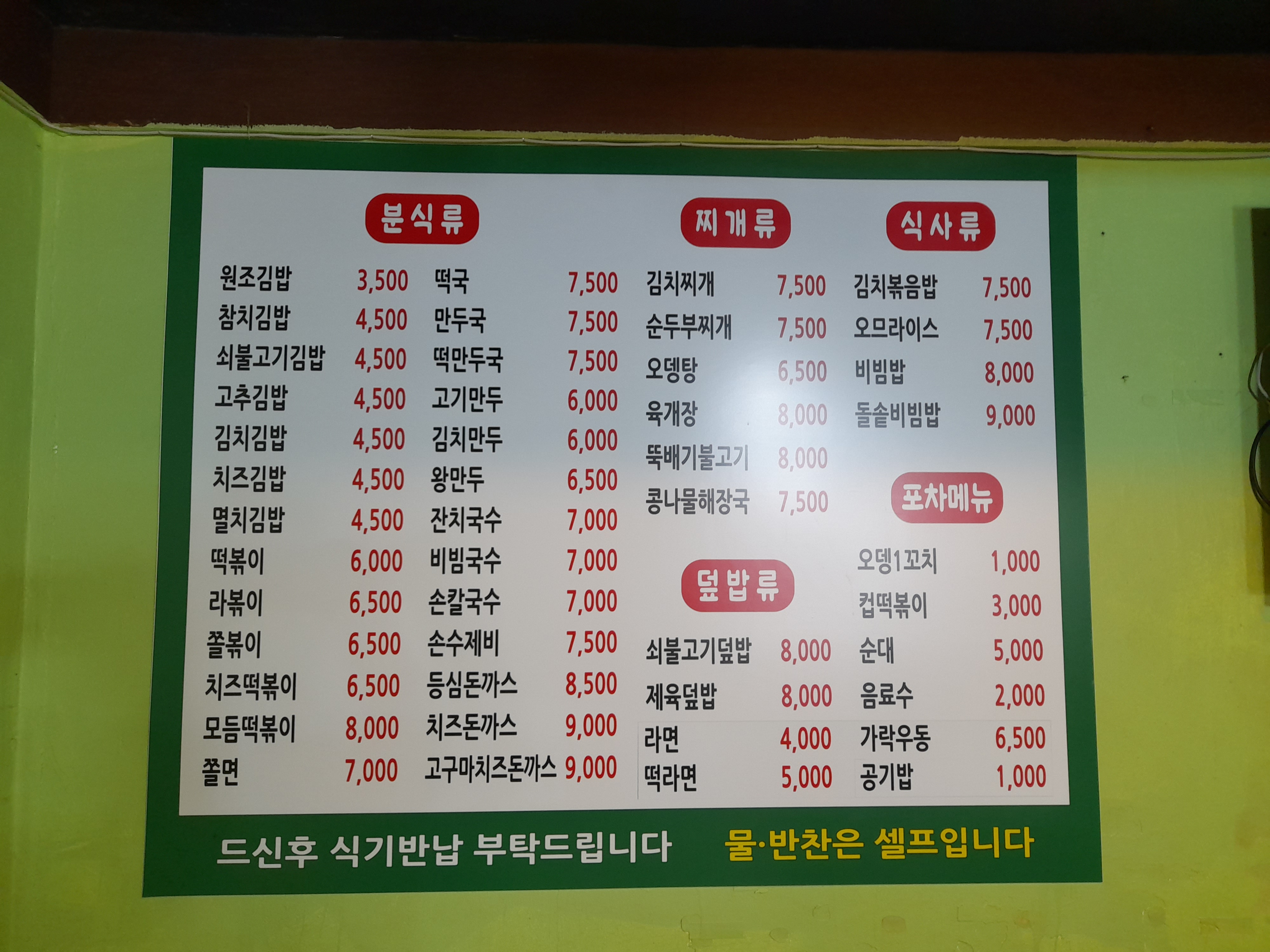 홀한쪽에 자리를 잡고 메뉴판을 보고 저의 최애 메뉴인 참치김밥과 라면을 주문했읍니다.입맛에 따라 식사류 분식류가 준비되어 있어서 기호에 맞게 선택 주문이 가능합니다.
