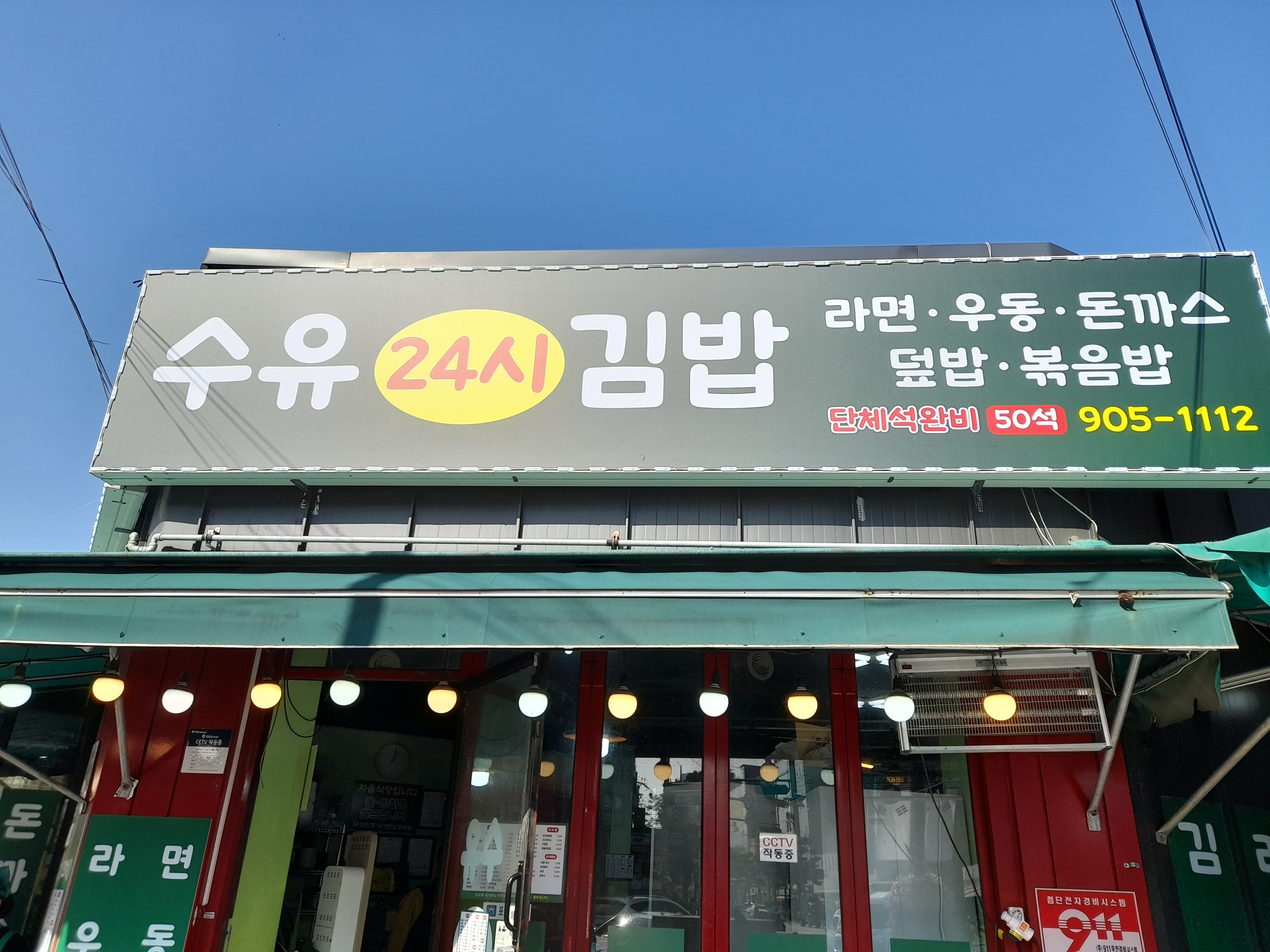 수유동 우리들병원 사거리에 새로 오픈한 수유동맛집 수유김밥입니다.수유김밥 맛집은 우리들병원 사거리 정류장인 광신사거리 정류장 바로 앞에 위치하여 있어서 식당을 찾기도 수월합니다.주차는 힘든곳이라 대중교통을 이용한 방문 및 배달주문이 편합니다.