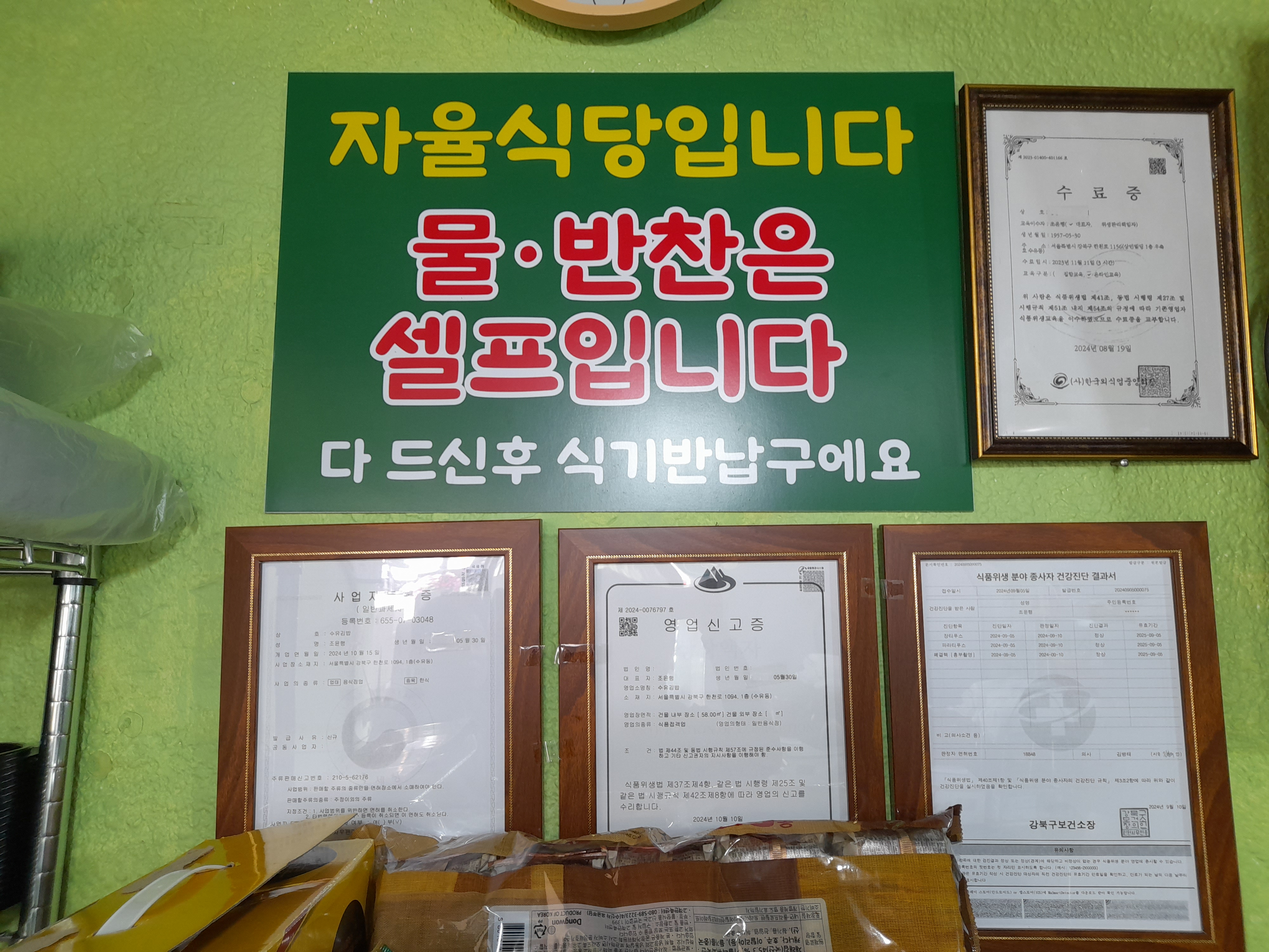 음식을 주문하면 테이블까지 가져다 주시고 물이나 반찬은 셀프로 운영되는 자율식당 입니다.식사가 끝나시면 식기반납구에 다드신 식기를 가져다 주시면 됩니다.