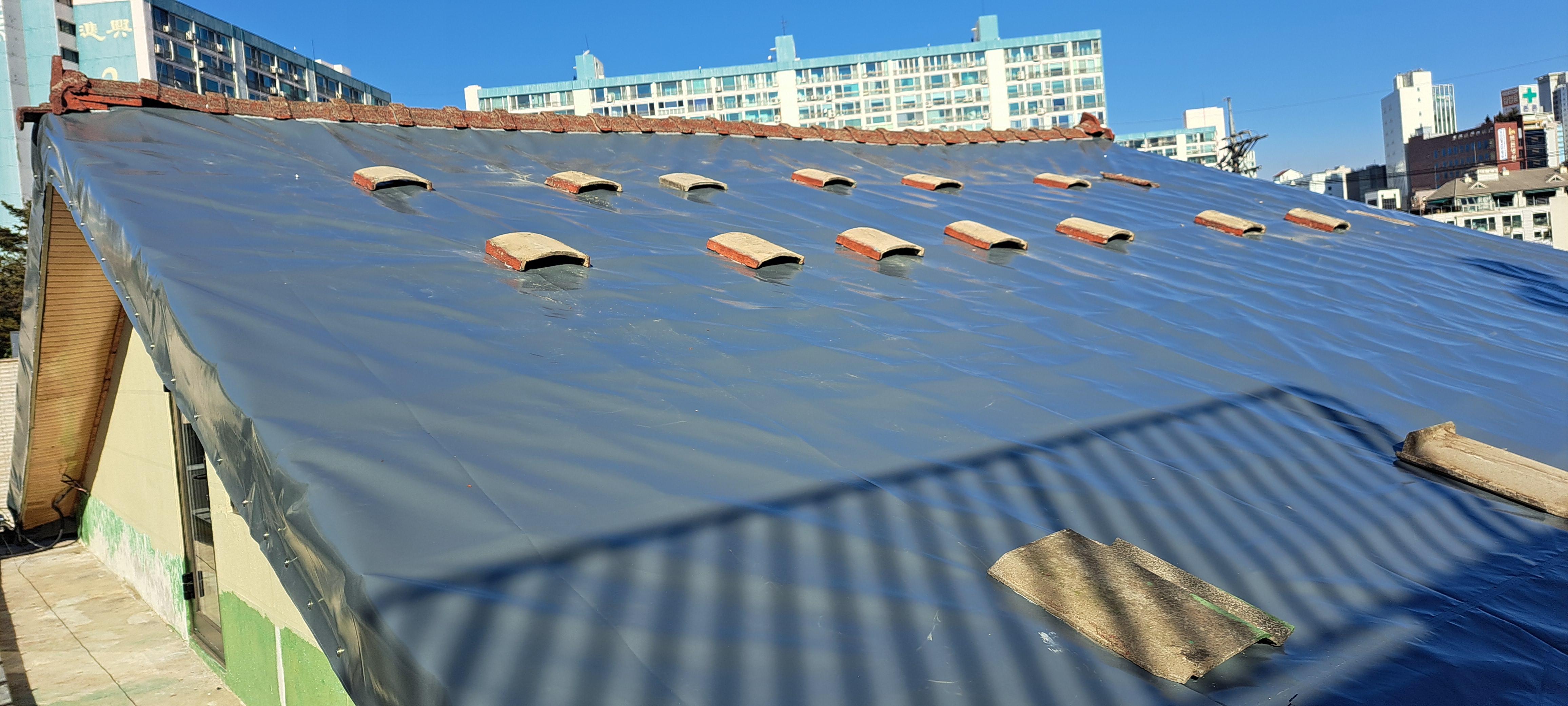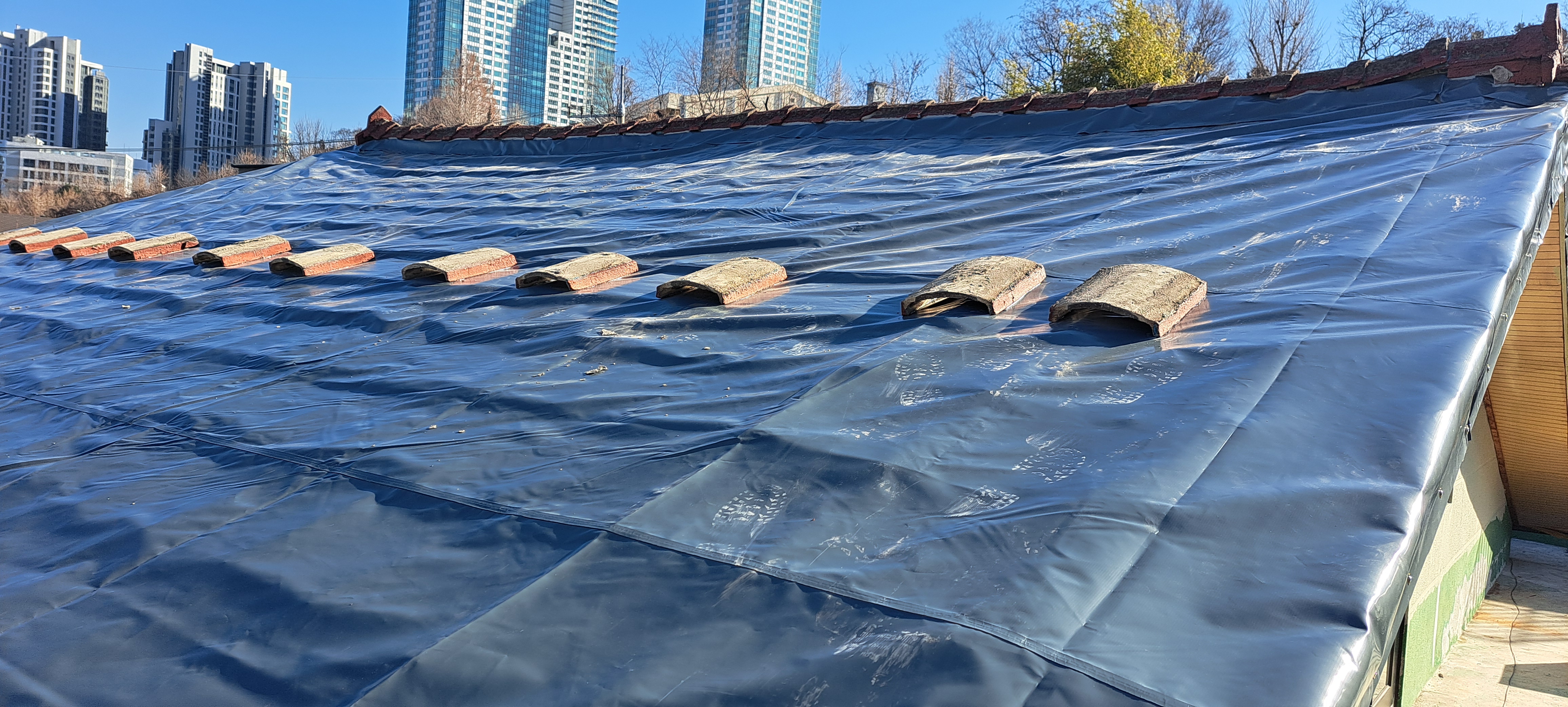 타포린방수포 방수천막을 지붕전체에 덮고 전용마감재를 사용하여 튼튼하게 고정하고 2중으로 기와를 올려서 추가 고정한 모습입니다.간혹 타포린방수포 자재만을 구매해서 셀프시공을 문의하시는 분들도 계시는데 간혹 강풍이 불때 셀프시공한 현장에서 천막이 날라가서 옆집에 피해가 발생했다는 이야기를 하시면서 전문가에게 작업을 맡기고 싶다는 연락을 주셨던 내용도 있습니다.몇일전 강풍이 불때 문의 연락중에 위와같은 내용을 문의하시는 분들이 정말 많었습니다.