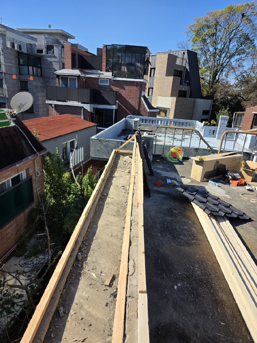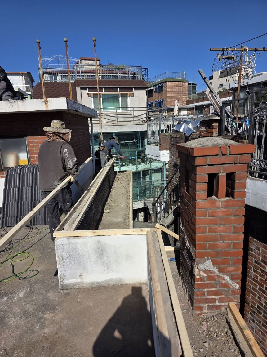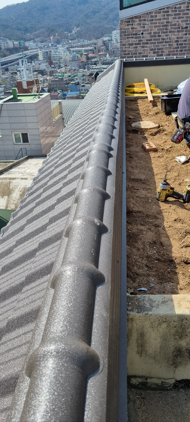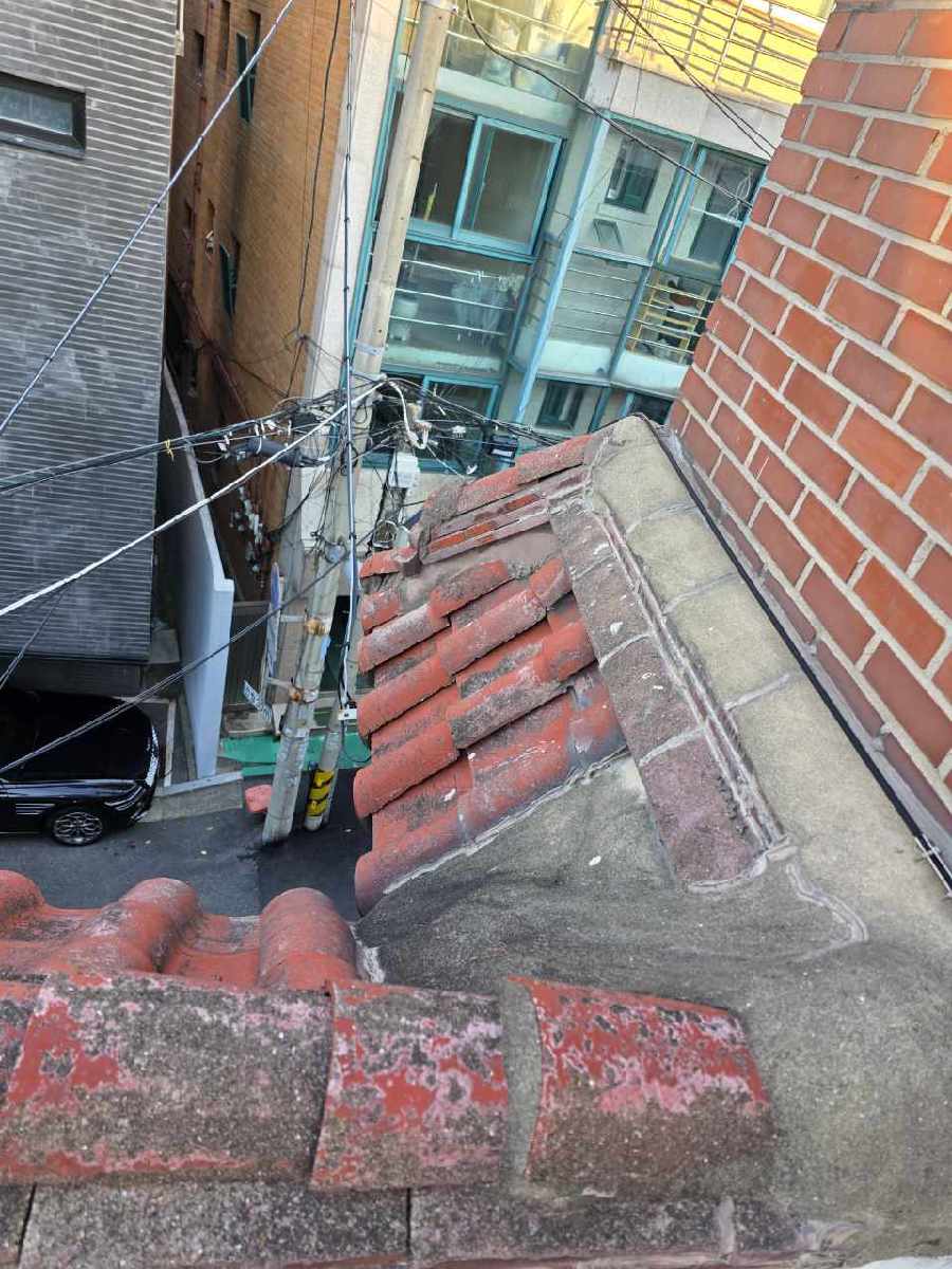 안녕하세요 금일 소개하여드릴 현장은 용산구 후암동에 위치한 다가구주택입니다.주택 옥상 난간에 설치된 시멘트기와가 오래되고 부식되어 추락 및 지붕누수 문제가 발생중입니다.위 현장의 해결책은 옥상 난간에 설치되어진 기와를 모두 철거하고 목재하지 프레임설치 지붕방수 지붕공사를 새로 진행하고 그 다음 공정은 지붕크기에 맞게 제작한 칼라강판을 목재위에 덮고 전용마감재로 고정하면 비가새지 않고 이탈 탈락되지 않는 칼라강판 지붕이 완성됩니다.