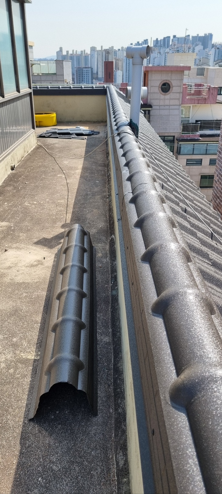 위현장에 설치되어있던 지붕자재는 시멘트기와이며 1990년도에 많이 시공하였습니다.그당시 옥상 난간에 설치할수 있었던 지붕자재가 시멘트기와가 유일하였습니다.시멘트기와는 시공후 20년정도가 되면 시멘트 표면이 부식되어 빗물이 흡수되는 단점이 있습니다.이문제를 해결하기 위해서 기와페인트를 칠하기도 하는데 기와도색작업비용에 약간의 비용을 추가하면 칼라강판을 설치할수 있읍니다.
