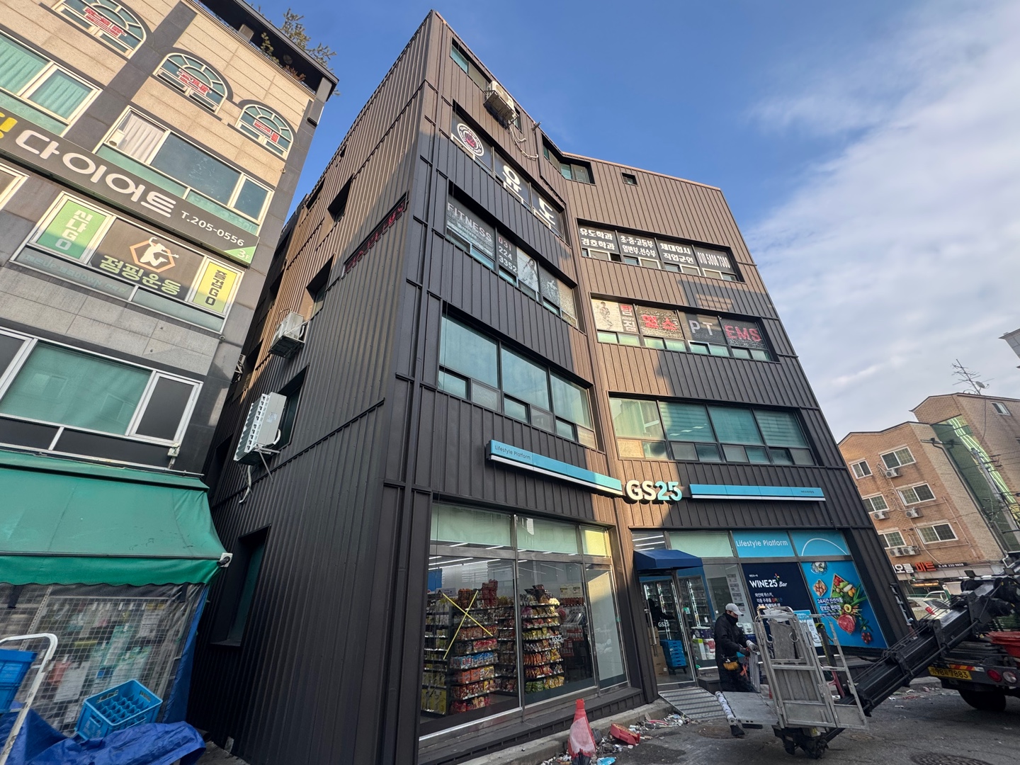 외벽 벽면에 칼라강판을 시공하려면 간판철거를 진행하고 아시바(비계)설치 작업을 먼저 진행합니다.이번 현장은 드라이비트가 시공된 현장이라 하지 프레임 설치 작업시에 아연 각관를 설치하여 튼튼하고 단단하게 외벽에 고정하였습니다.외벽에 칼라강판을 시공하는 작업시에는 스카이 장비차량에 탑승하여 진행하기에는 안전에 문제도 있고 작업시간이 오래걸려서 작업 능률이 오르지 않는 문제가 발생합니다.작업자의 안전과 빠른 작업을 위하여 아시바 설치후 작업하는것 입니다.