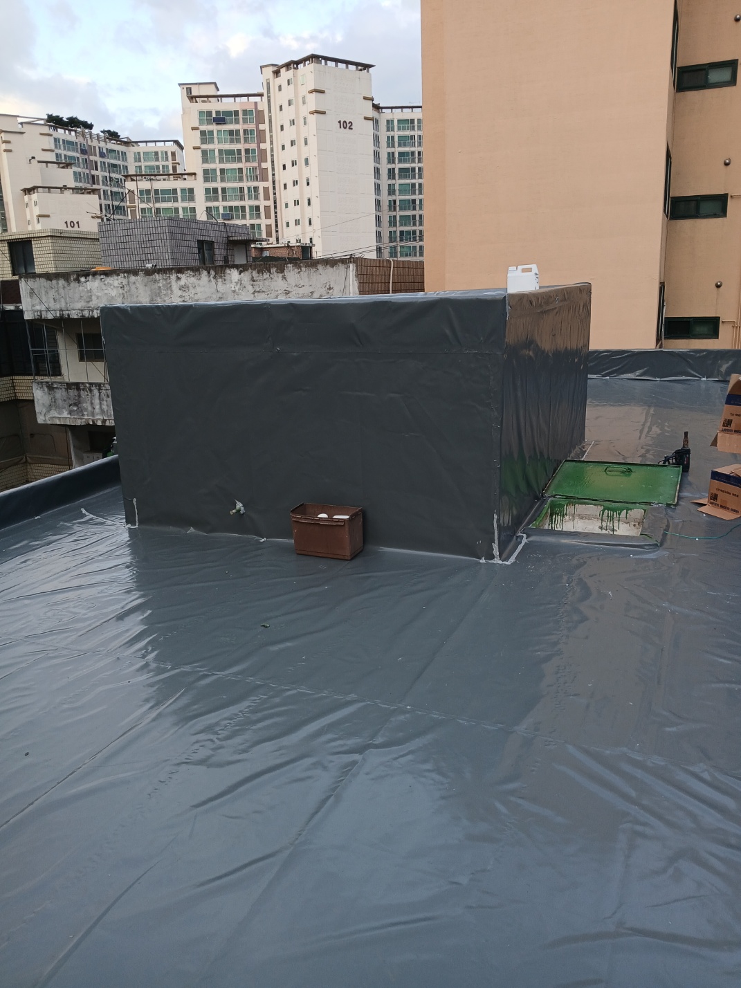 옥상 바닥만 덮는것이 아니라 옥탑 바닥 및 옥탑 벽면까지 물이타고 들어가지 쉬운 모든 부분을 타포린방수포 방수천막으로 감싸서 시공하여 누수가 발생하지 않도록 작업합니다.타포린방수포 방수천막 시공중 주름이나 들뜸이 발생하지 않도록 최대한 팽팽하게 당겨서 시공을 진행합니다.기존 녹색 바닥이 회색 계열의 타포린방수포 방수천막으로 정리되어 옥상 전체가 훨씬 안정감 있고 정돈된 인상으로 바뀐것을 볼수 있습니다.단순히 보기 좋은것에 그치지 않고 실제로 빗물이 기존 취약면에 직접 닿는 것을 줄여주는 것이 핵심입니다.