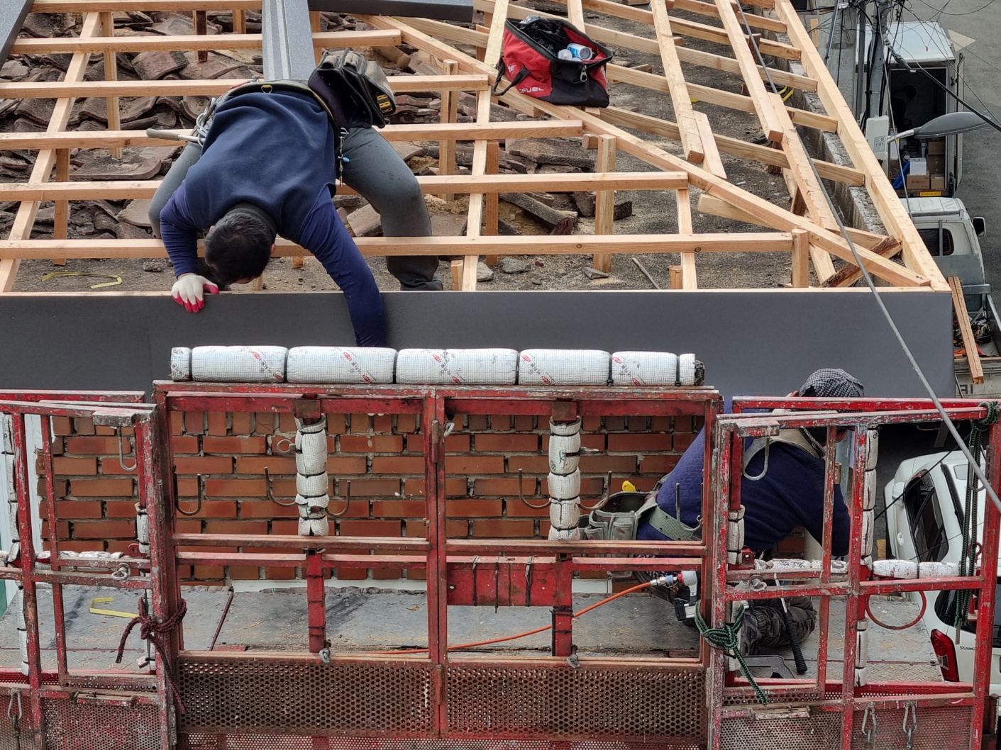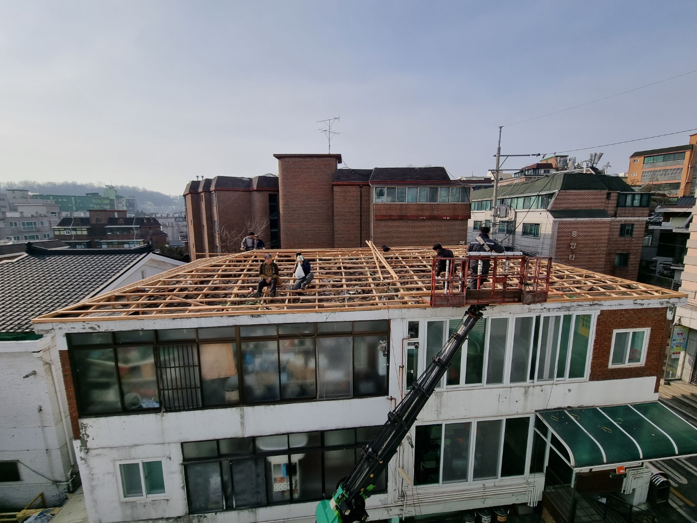 목재를 사용하여 지붕의 뼈대를 만드는 작업 입니다.